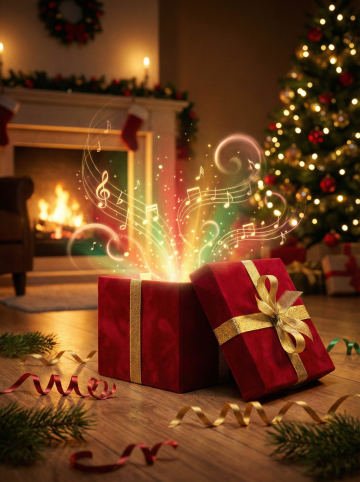 暖金背景下的圣诞树,融合3D与重拟物风格,点缀红苹果与光晕星饰,雪落粒子营造梦幻光影,礼盒堆叠传递喜庆温馨的节日氛围。