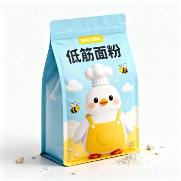 " 低筋面粉自立袋包装设计,45 度侧前方视角(略微俯视);包装正面中文 ' 低筋面粉 ',顶部logo 'GAO DING';包装插图:麦田插图;纯白色背景,3D 立体渲染,高清质感
