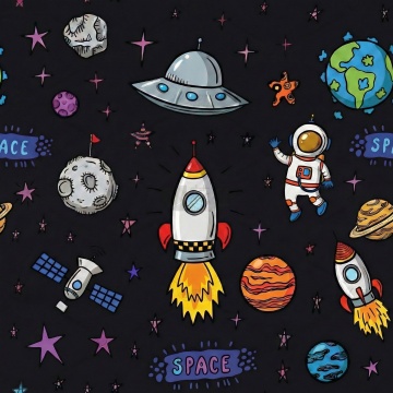小学生,穿着宇航员服饰,翱翔太空,背景为星空