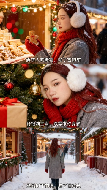 三宫格艺术感写真图,横向三宫格。画面中人物神情忧郁,身着灰色毛呢外套、搭配红色针织围巾与手套、佩戴白色毛绒耳罩。第一张近景:人物站圣诞市集摊位前托姜饼人,侧脸,头发落雪,背景圣诞灯串,红绿彩色光斑,字幕 “姜饼人的糖霜,粘了雪的甜 The frosting of the gingerbread man sticks the sweetness of snow”;第二张特写:人物脸靠装饰圣诞树,旁侧礼品盒,金红光斑,字幕 “铃铛响三声,没等来你身影 The bell rings three times, not waiting for your figure”;第三张远景:人物背影走市集出口积雪路,字幕 “圣诞树下的愿,成了旧时光 The wish under the Christmas tree becomes old times”。整体暖光光线,采用柯达胶片效果,三张图合成一个三宫格,字幕位于底部。