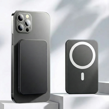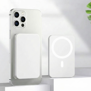 一个简约现代风格的白色充电宝,采用光滑细腻的哑光材质,边缘圆润处理,正面有品牌logo和四个电量指示灯,底部配备两个USB-A接口和一个USB-C接口,轻盈悬浮在流动感十足的白色丝绸背景上,背景采用柔和的浅灰色渐变,整体画面干净通透,光线从左上方柔和照射,在充电宝右侧和丝绸褶皱处形成自然的高光与细腻阴影,营造出优雅、科技感与质感并存的氛围,构图以充电宝为视觉中心,丝绸背景呈波浪状环绕,凸显产品的简洁设计与高端品质。