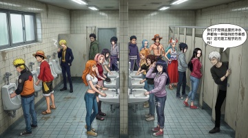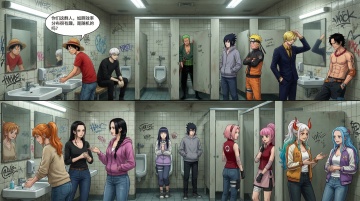 画面中有许多经典索隆场面呈螺旋状排列,主人公草帽一伙在旋转的海报中行走。固定聚焦在他身上,周围呈现朦胧模糊、涂抹、拖影的效果。