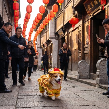 国潮风市集,毛发生长风装饰的自行车与梦幻粒子飘动,喜庆红灯笼与卡通虎纹围裙交织中式感,轻拟物风呈现节日欢乐氛围。