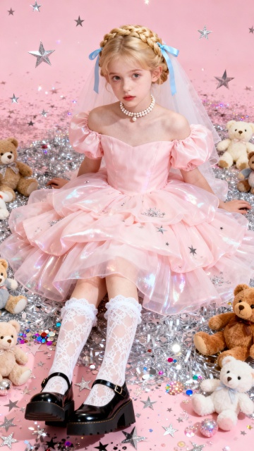 穿搭:浅米色吊带蓬松长裙,裙摆带有褶皱肌理,发丝间点缀白色小花发饰,整体造型轻盈、仙气