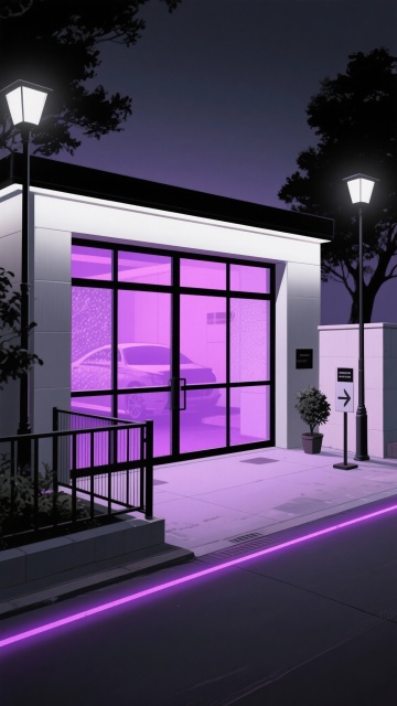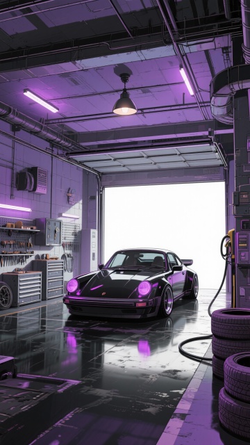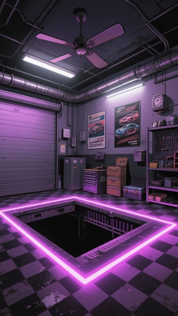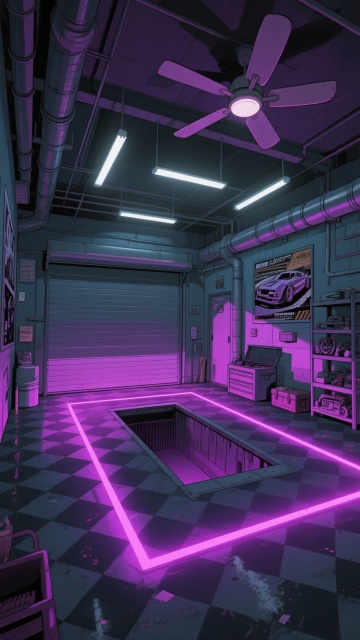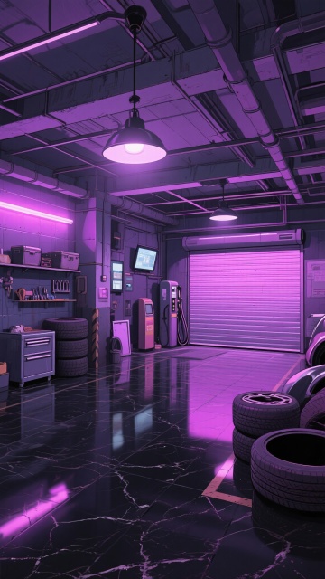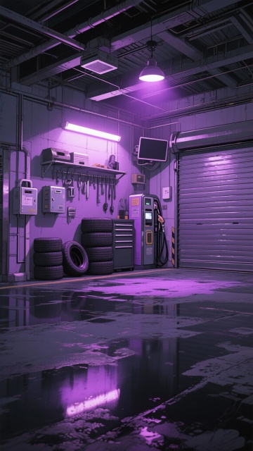 二次元,车库,高级,细节丰富,紫黑色,氛围是魅惑、下沉,生成2张,不要人,4k