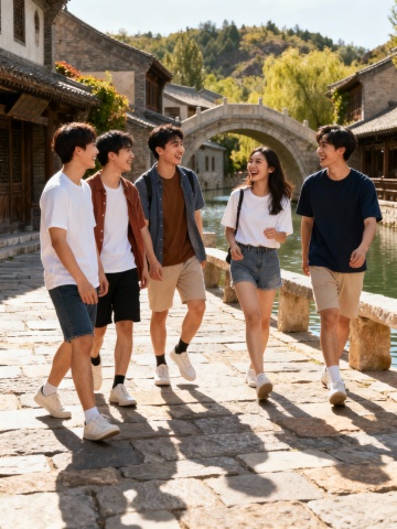 一群年轻朋友在开阔的自然风景中与复古旅行车互动的活力场景,写实风格摄影,明亮通透的光线,天空呈现清澈的渐变蓝色,地面是绿色草地和远处的山丘,复古绿色旅行车停在画面中央,朋友们穿着休闲夏装,有的站在车旁、有的从车门探身、有的单脚踩在踏板上,所有人都举起手臂做出欢快的姿势,脸上洋溢着灿烂笑容,整体氛围轻松愉悦充满青春气息,展现不同的旅游出行方式,画面构图饱满,色彩清新自然,人物姿态生动富有动感,远处的自然景观与前景的人物车辆形成和谐的空间层次。