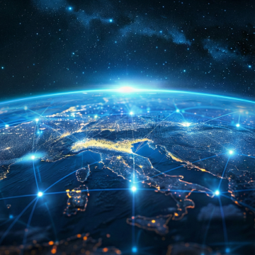 白色背景下的3D地球数字艺术,地球表面呈现深蓝色调,以精细的网格线和点阵构成大陆轮廓,大陆区域填充有密集的蓝色数字代码纹理,整体保持科技感与未来感的视觉风格。地球被发光的红色线条网络环绕连接,线条上分布着明亮的红色光点,形成动态的全球互联效果,光线具有轻微的光晕和辉光质感,阴影细节柔和,整体构图居中对称,展现出科技与全球化主题的和谐统一。