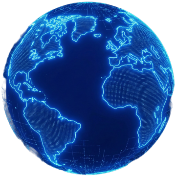 白色背景下的地球半解剖结构线框图形,采用渐变霓虹蓝与紫色线条,呈现未来科技感风格,节点为发光圆点,线条流畅且具有轻微的光晕效果,保持原有的世界地图轮廓和网络连接结构,整体设计简洁现代,突出科技与全球化主题的视觉表现。