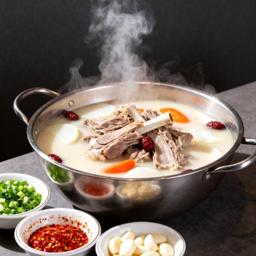 中式暖锅,金属质感锅具盛装热气腾腾的羊骨汤,搭配油润汤汁与液态光影,辅以葱花、辣椒、蒜瓣点缀,实景感十足,传递质朴温馨的冬日食光。
