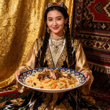 画面中人物穿着维吾尔族传统的艾特莱斯服饰,手中端着一盘丰盛的抓饭,餐具带有特色维吾尔族花纹,背景搭配民族风格织物,强化了地道的特色美食氛围。