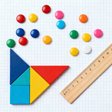 一组6个完全不同的绘画工具元素集合,保持统一的卡通手绘风格,每个元素独立置于纯白色背景上,采用规整的网格排布。元素包括:1. 黄色木质铅笔与卷笔刀组合,铅笔带有红色橡皮擦头,卷笔刀旁散落几小段木屑;2. 蓝色金属圆规与黄色量角器叠放,圆规针尖锐利,量角器刻度清晰;3. 绿色塑料水彩颜料盒,盒盖打开露出12格不同颜色的颜料,附带一支平头水彩笔;4. 红色皮革材质素描本,翻开的页面上有简单的线条速写,本子边缘有金属螺旋装订;5. 紫色马克笔套装,5支不同粗细的马克笔并排摆放,笔帽颜色与笔身一致;6. 橙色陶瓷调色盘,盘内有5个颜料格,其中三格装有不同颜色的油画颜料,调色刀斜放在盘边。所有元素均采用平滑的边缘处理,明亮饱和的色彩,简洁的线条勾勒,以及轻微的立体阴影效果,整体呈现出活泼可爱的视觉风格。
