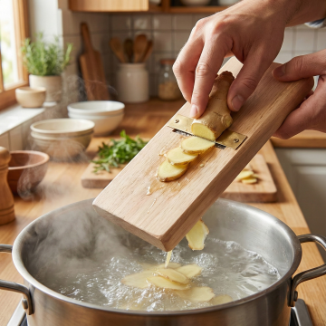 一张木纹清晰的浅色木质砧板平放在深色木质桌面上,砧板周围散落着几颗黑色胡椒粒和几片八角,背景是温馨的厨房环境,有挂着的厨具和朦胧的暖黄色灯光,整体呈现出真实细腻的食物摄影风格,暖棕色为主色调,光线柔和自然,阴影细节丰富,营造出舒适宁静的烹饪氛围。