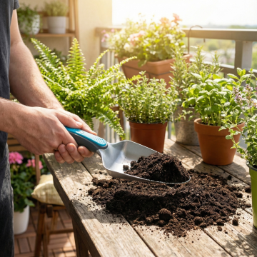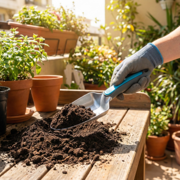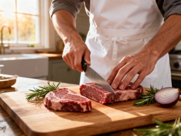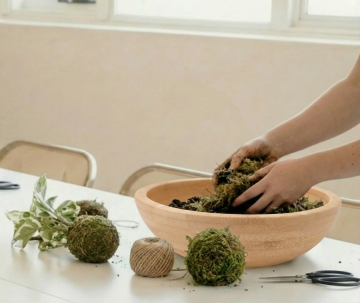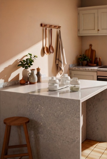 中景俯视角,在一个融合自然材质与几何美学的日式侘寂风厨房空间,浅米色硅藻泥墙面与烟熏橡木色的悬浮式橱柜形成温暖对比,台面选用带有天然冰裂纹理的火山岩材质,边缘打磨得圆润柔和。晨光透过亚麻质地的半透光障子门,在地面投下细密的木纹格栅阴影,光线呈现出柔和的米黄色调。料理台上,粗陶制成的深褐色食器套装随意摆放,旁边是一个手工编织的藤篮,里面盛放着几颗表皮粗糙的柑橘,复古铸铁茶壶正冒着袅袅热气,旁边点缀着一株小型琴叶榕盆栽,叶片上的天然虫洞更显岁月质感。开放式层架上陈列着不同釉色的粗陶碗碟,墙面悬挂着手工锻造的铁艺锅铲套装,整体构图强调材质的原始肌理与器物的自然磨损感,营造出淡泊宁静又充满生活温度的烹饪空间。