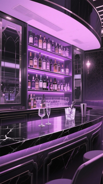 二次元,酒吧落地玻璃,高级简约,细节丰富,紫黑色,氛围是魅惑、下沉,生成2张,不要人,4k