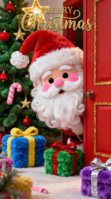 一个圣诞老人从红色的门后探出头来的特写,地上散落着色彩缤纷的礼物,背景远处还有一个巨大的圣诞树