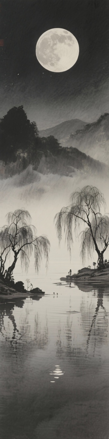 俯瞰视角,中国水墨意境的山水长卷在晨雾中徐徐展开,近处苍劲的松枝以焦墨勾勒,松针如剑般刺破薄雾,中景层叠的山峦以浓淡不一的墨色晕染出阴阳向背,山脊线在湿润的宣纸上自然渗化出朦胧的轮廓,远处淡墨渲染的峰峦在云海中若隐若现,几缕淡赭色的晨光穿透云层洒在最高的峰顶,留白处的云雾以飞白笔法表现出流动感,一叶孤舟在山脚下的江面若隐若现,整幅画面呈现出"墨分五色"的层次感与东方哲学的空灵意境。