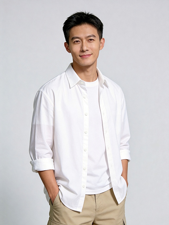 正面半身男模特,融合霍建华年轻时的清朗儒雅、敖瑞鹏的俊朗立体、吴彦祖年轻时的英气轮廓,五官精致立体,气质干净阳光,穿着简约纯白色T恤,背景为干净的米白色纯色背景,光线柔和自然,面部线条流畅,整体质感高级高清详情