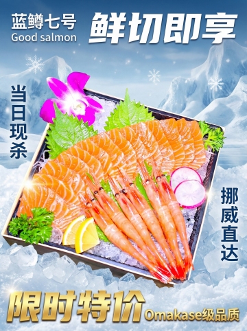 重拟物风结合实景感,冰晶光影营造清爽氛围,印刷风字体强化促销感,时尚现代布局突显挪威直送鲜切三文鱼与虾的高端品质。