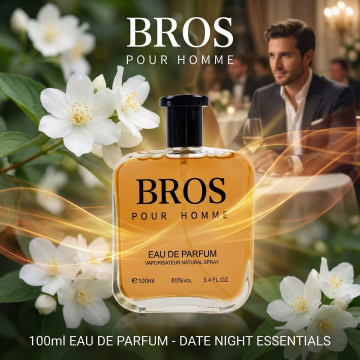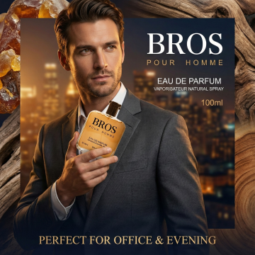 为这款100ml男士香水,生成6张宣传海报,图片尺寸比例1:1,高级调性,符合欧美审美,海报上的文案是英文,不能有中文,贴合产品卖点,卖点参考以下: BROS 男士香水 | 25 + 轻熟男的「松弛氛围感香」 ✅ 香调: 开场是「海水 + 柑橘」的清冽海风,中调裹着温柔茉莉香,收尾是龙涎香 + 愈创木的沉稳木质调,越闻越有高级松弛感 ✅ 外观: 琥珀方瓶 + 极简黑盖,质感拉满,摆在哪都是低调装饰 ✅ 适配: 职场通勤不扰人、约会社交有氛围、休闲出游够清爽,全场景 hold 住 100ml 大容量,一瓶承包你的「日常高级香」