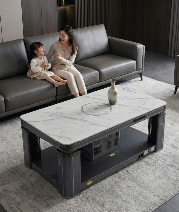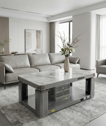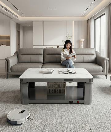 将取暖桌放置于浅白色系客厅中,正面角度,放在灰色沙发前,客厅背景大气简洁,沙发是超长高级的牛皮质感,沙发上坐着一位年轻的中国你好在看手机,地毯颜色是浅灰色质感,突出取暖桌,取暖桌侧前方有扫地机,取暖桌占画面70%的面积,画面质感强,写实风格