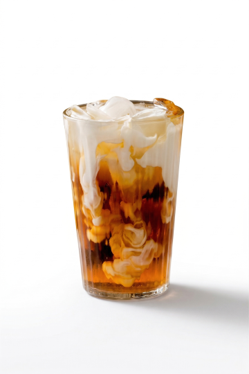 一杯透明塑料杯中装满冰块和深棕色奶茶,杯口边缘斜放着一片完整的柠檬片,杯内悬浮着数片厚薄不一的柠檬片,奶茶表面有细密气泡,整体呈现出高光泽、超写实的质感,光线从左上方照射,在杯身右侧形成渐变阴影,背景为纯白色,突出饮品主体,营造出清爽、诱人的夏日氛围。