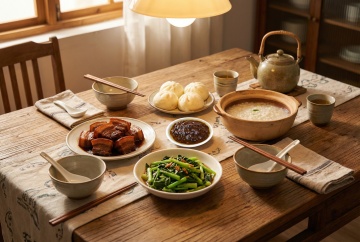 一张精心布置的餐桌,桌上摆放着各种美食,有三文鱼、烤虾、沙拉、蔬菜、水果和饮品等,餐具精致,桌布素雅,旁边有白色的花瓶和盛开的白色花朵,整体呈现出温馨、自然、明亮的居家氛围,光线柔和,色彩清新淡雅,构图饱满,细节丰富,展现出舒适的用餐场景。