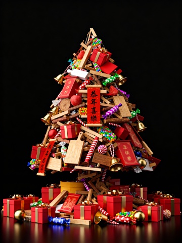 3D重拟物风圣诞树,融合木雕、金属与鎏金元素,极繁主义拼贴中式喜庆符号,红金撞色彰显节日欢愉。