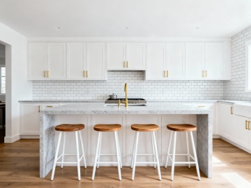 轻奢法式 / 轻美式风格的厨房,整体设计优雅精致,主打纯白色调 + 实木质感:露出白色平坦天花板,整体画面居中对称, 橱柜:纯白色实木柜体,搭配精致金属把手,线条简约流畅,既显浪漫又耐用;部分柜体带玻璃门,方便展示餐具。 功能区:核心是大尺寸岛台,既提供操作空间,也能当用餐吧台(配 5 把带铆钉装饰的轻奢风高脚椅),兼顾实用与颜值。 细节:墙面用大理石纹理的岩板 / 瓷砖做背景,深色实木地板,点缀出轻奢氛围;厨房还连通室外空间,采光通透。