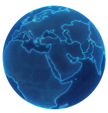 白色背景下的地球半解剖结构线框图形,采用渐变霓虹蓝与紫色线条,呈现未来科技感风格,节点为发光圆点,线条流畅且具有轻微的光晕效果,保持原有的世界地图轮廓和网络连接结构,整体设计简洁现代,突出科技与全球化主题的视觉表现。