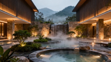 中式庭院,灰砖黛瓦,水墨意境。几何构图,石刻质感,静谧深远,雾山隐现,东亚古典美学与实景交融。