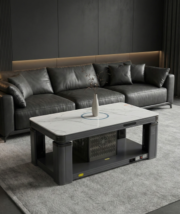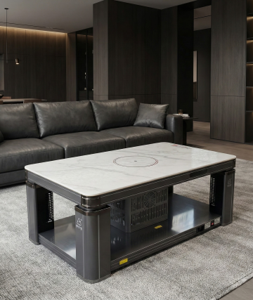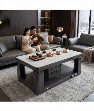 将取暖桌放置于浅灰色系客厅中,放在白色沙发前,桌上放着西瓜和水果,客厅背景大气简洁,夏日氛围,沙发是超长高级的牛皮质感,沙发上坐着一对年轻的中国情侣在吃水果,地毯颜色是浅灰色质感,突出取暖桌,取暖桌占画面80%的面积,画面质感强,写实风格