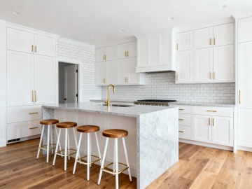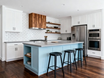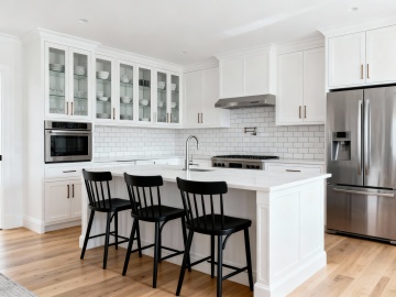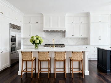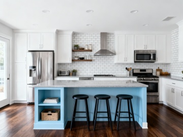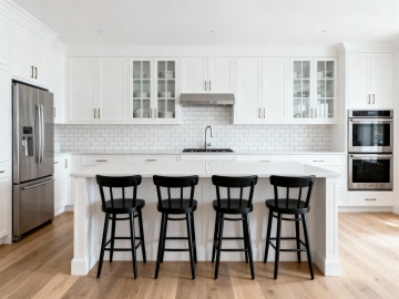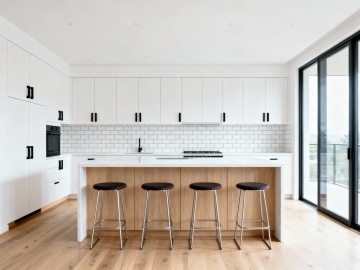 布局:以白色为主色调,搭配浅木色地板,显得干净清爽;核心是岛台 + 餐桌一体设计(图中岛台既是操作台面,也可作为用餐区),搭配 4 把金属框架的吧椅,适合日常用餐或朋友小聚。
