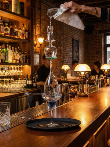 温馨雅致的日式怀石料理餐厅内部场景,暖色调木质装潢与深色餐桌形成沉稳对比,天花板悬挂着散发柔和暖光的方形和纸灯笼吊灯,中央摆放着插有白色花枝的深色陶瓷高瓶,餐桌铺着素雅的浅色桌布并整齐摆放着精致的日式餐具与高脚酒杯,背景可见木质酒架与柔和灯光点缀的吧台,整体氛围宁静而富有禅意,光影柔和细腻,营造出静谧舒适的用餐环境。