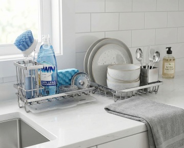 一个明亮整洁的现代厨房,采用简约优雅的设计风格,以白色为主色调,搭配黄铜色金属装饰细节。厨房整体呈现出温馨舒适的氛围,阳光透过百叶窗洒入,在白色橱柜和大理石台面上形成柔和的光影效果。白色的橱柜带有黄铜色的圆形拉手,上方的吊柜和下方的地柜组合提供了充足的储物空间。大理石台面光滑洁净,带有自然的灰色纹理。台面上有一个双槽不锈钢水槽,搭配黄铜色的水龙头。水槽旁边的金属桶里插着木质的锅铲和汤勺。墙面安装着黄铜色的挂杆,上面挂着各种木质和金属材质的厨房用具,包括勺子、铲子等。挂杆上方的白色搁板上摆放着不锈钢和玻璃材质的储物罐,里面装着各种香料和食材。台面上还摆放着一个白色的盘子,里面放着几块叠在一起的三明治,旁边还有一盘色彩鲜艳的沙拉。整体构图采用了三分法,光线从左侧窗户进入,营造出明亮通透的感觉,细节丰富,质感细腻,展现出干净利落的现代厨房设计感。