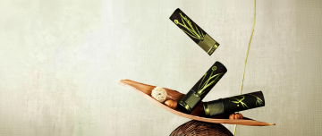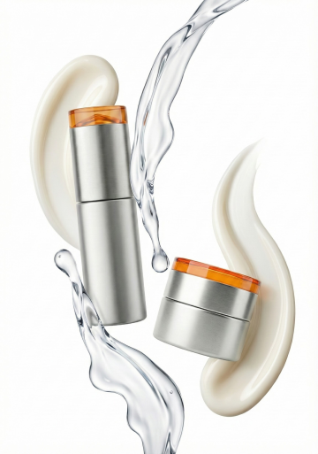 超写实电商产品图,被形态各异的透明水珠、水簇环绕,部分水珠附着产品表面。背景为低饱和渐变底色,冷调光源从侧下方照射,凸显产品科技感与成分专业性。材质表现哑光细腻,色彩搭配以主体色彩为主,色调柔和高级,构图采用轻微倾斜角度,动态元素环绕主体,含品牌 logo
