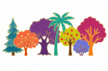 白色背景上,十二棵扁平化风格的夏日树木图标,每棵树形态各异,树干为深棕色,树冠颜色改为明亮的夏日色调,包括阳光黄、天空蓝、薄荷绿、浅橙色和粉色,保持简洁的轮廓线条,无内部细节纹理,均匀排列成三行四列,整体呈现清爽、明快的夏日氛围,符合图标设计的简洁性和识别度。
