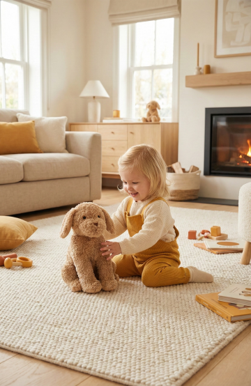 图片中的实物保持不变,生产小女孩在家里的桌子上,双手捧着毛绒公仔。背景模糊状显示。聚焦产品细节质感。治愈系风格