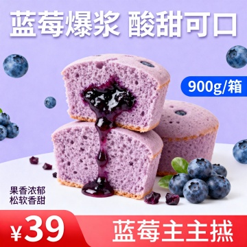 蒸蛋糕电商主图,展示奶香味蒸蛋糕,3个蛋糕堆叠,顶部撒少量奶粉,旁边放一杯牛奶和打开的牛奶盒。背景为淡蓝色,点缀牛奶波纹图案。顶部标题“浓郁奶香 松软细腻”,右侧标注“900g/箱”,底部红色价格标签“¥39”,左下角小字“奶源优质 口感绵密”。整体风格清新明亮,突出奶香味特色。