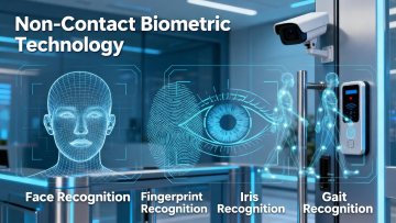 未来感3D风设计,融合科技蓝霓虹光影与金属质感,展现虚拟现实中的非接触生物识别技术,突出商务智能与安全验证的前沿场景。