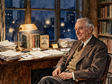 画面中心是一轮巨大的发光的月亮,弯弯的月亮,不是满月,月亮的下沿上坐着一个英国绅士,他的大小只有月亮的五分之一,向左上方望去,他头发凌乱,身穿邋遢的衬衫,手里握着一只油画画笔,深蓝色背景,灵感来自于名著《月亮与六便士》