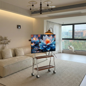 一台现代超薄液晶电视,屏幕上显示着高清写实风格的雪山风景,画面中巍峨的雪山峰顶覆盖着洁白的积雪,山体呈现出灰黑色的岩石纹理,山脚下是金黄色的植被和蜿蜒的河流,河流中点缀着大小不一的黑色岩石,天空是清澈的淡蓝色,整体色彩鲜明,光影层次丰富,电视的银色金属支架支撑着屏幕,展现出简约而现代的设计感。