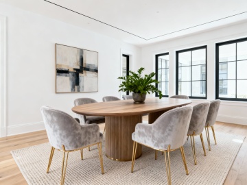 核心家具:正面一张椭圆形木质餐桌,搭配浅灰色丝绒餐椅(椅腿是金色金属质感),配色柔和又显高级;