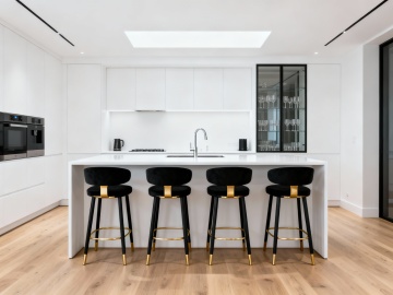 现代轻奢风格的餐厅空间,整体氛围明亮优雅,细节处透着精致感:露出白色平坦天花板,正面餐厅