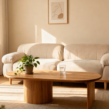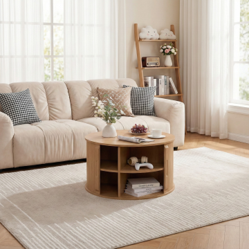 主体家具:圆形的木色圆桌。墙面:白色法式墙面, 环境背景:浅米色布艺沙发(沙发上有一个米白色的几何毛毯),带书籍的边几,边几旁边有一个白色大落地窗,搭配白色的透明窗帘,窗外可清晰看到绿色风景,浅灰色几何纹理地毯,整体是温馨简约的现代客厅风格。 氛围:日常居家、实用多功能的生活场景,光线柔和温暖。