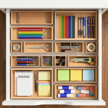 制作这个收纳柜电商的场景图,把它放在明亮简约的卧室的抽屉里,棕色的地板,白色抽屉里收纳柜里添加着化化妆品和护肤品,粉底液,盖着盖子的眼影盘,喷雾爽肤水,面霜,唇釉,睫毛夹,眼线笔,平放着的化妆刷,粉扑,美妆蛋,棉签。可以看见抽屉内部的收纳柜,整体画面协调完美,摆放饱满整齐,收纳舒适,8k超清,细节完美,从上往下的拍摄角度