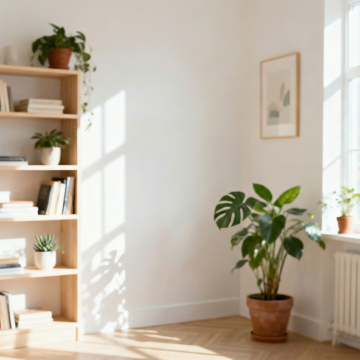 现代简约风格客厅室内设计,从不同角度展示的房间背景,白色为主色调搭配浅木色地板和原木色家具,柔和自然光从大窗户洒入形成温暖光影效果,浅灰色布艺沙发配白色和浅蓝色靠垫,米白色地毯铺于地面,木质茶几上摆放简约装饰品,靠墙木质置物架陈列设计感小物件,绿色大型绿植增添生机,整体空间明亮通透、干净整洁,采用不同的家具摆设布局和柔和淡雅的配色方案,营造舒适宁静的居住氛围,高清3D渲染,写实质感,极简主义设计美学,留白充足,空间感强。