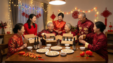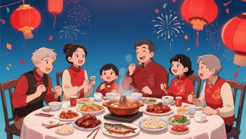 中式室内场景,暖色调氛围,背景是传统木格窗棂,悬挂两只红色纸灯笼(一只亮着暖光、一只带金色流苏);灯笼上有黑色书法字体“立冬”;前景木桌上,摆着两盘青花瓷盘装的白色饺子,旁侧两只深色小碗盛着红褐色茶汤,两双筷子,还有红色“福”字装饰与蓝色古籍;光线柔和偏暖,整体呈现立冬节气的传统温馨感,细节清晰、色彩真实自然。