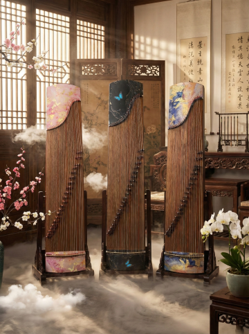 生成了一张适合营销的古筝宣传图。画面中三把古筝置于古色古香的中式场景,背景云雾缭绕,点缀着盛开的梅花与兰花,光线柔和明亮,突出了古筝的精致工艺与艺术美感,整体风格典雅大气。