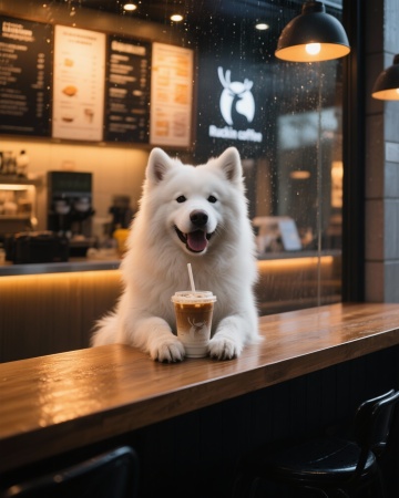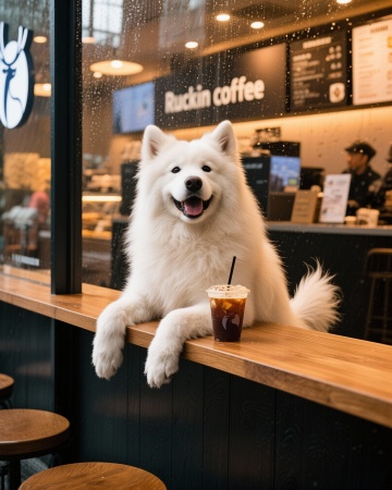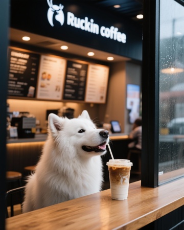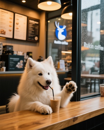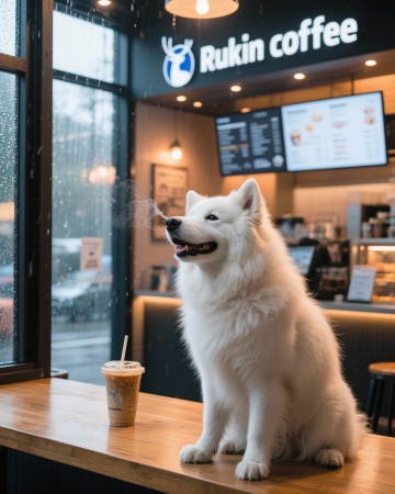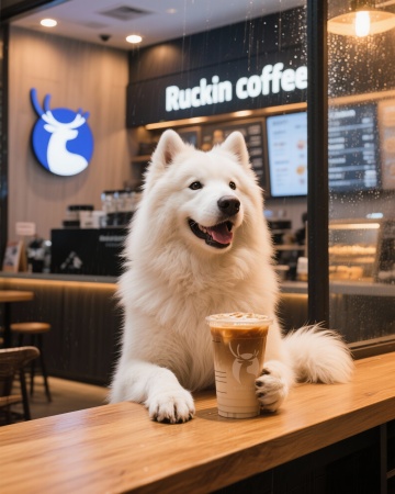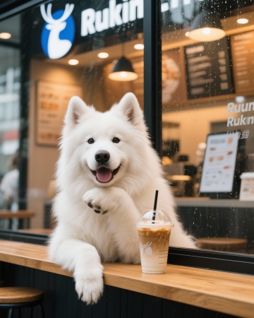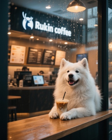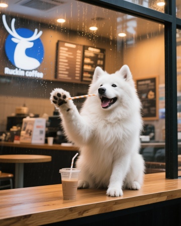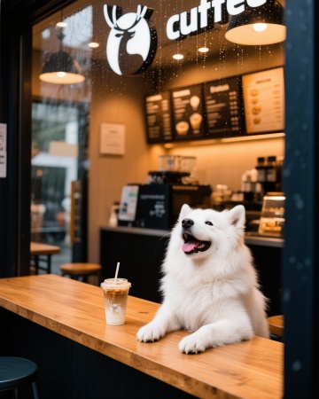 保持产品不变的情况下,材质不要变,乖巧靠在街边咖啡摊的木质吧台,旁边摆一杯带奶泡的拿铁,杯身贴简约标签,背景是街道绿植和原木色摊位,午后柔和侧光,低饱和莫兰迪色调,毛绒蓬松有光泽,画面慵懒惬意,高清质感图