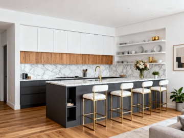 现代简约风格的厨房照片,整体氛围干净明亮:露出白色平坦天花板, 配色:以白色(橱柜、墙面)为主调,搭配浅灰色大理石台面、黄铜色五金,还有木质吧凳的暖调,清新又有质感。 布局:是开放式厨房 + 中岛的设计,中岛既当操作台也能作为用餐区,搭配 4 把带白色支架的木质吧凳。 细节:橱柜是简洁的平板门配金色把手,墙面贴了小白砖,整体风格统一又精致。